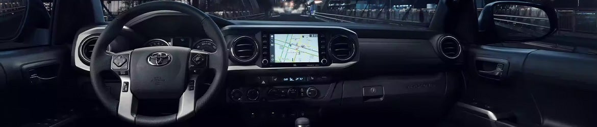 Toyota designed the Tacoma's interior to replicate its exterior toughness while still providing a certain degree of comfort and convenience. The entry-level SR trim offers cloth-covered manually adjustable front bucket seats with plenty of lumbar support, as well as a dual zone automatic climate control system and a telescoping steering wheel with audio controls. The Limited and TRD Pro add leather-trimmed seating surfaces for a more upscale, modern look. Two convenient USB charging ports allow for easier device charging, and the TRD Sport adds a wireless device charger. A six-speaker sound system and a 7-inch touchscreen compatible with Apple CarPlay and Android Auto come standard. With higher trims, you can upgrade to an 8-inch setup.