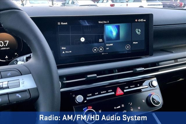 - Radio: AM/FM/HD Audio System -inc: 12.3" Audio-Video-Navigation (AVN) color touchscreen (ccNc) w/onboard navigation, 6 speakers, Blue Link+ connected car system, SiriusXM satellite radio w/3-month trial subscription, wireless Apple CarPlay and Android Auto integration, dynamic voice recognition, Over-the-Air (OTA) map updates and USB connectivity