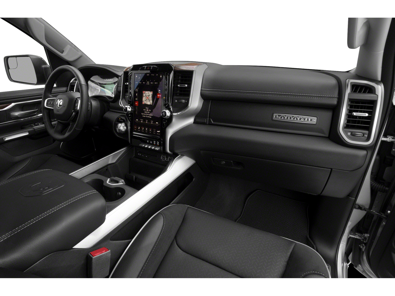 The interior of this Ram 1500 Laramie is equally impressive, with premium leather-trimmed bucket seats, a full-length upgraded floor console, and a host of advanced technology features. Enjoy the convenience of the Uconnect 4 infotainment system with an 8.4 touchscreen display, Apple CarPlay, and Android Auto integration. Stay connected and entertained on the go.