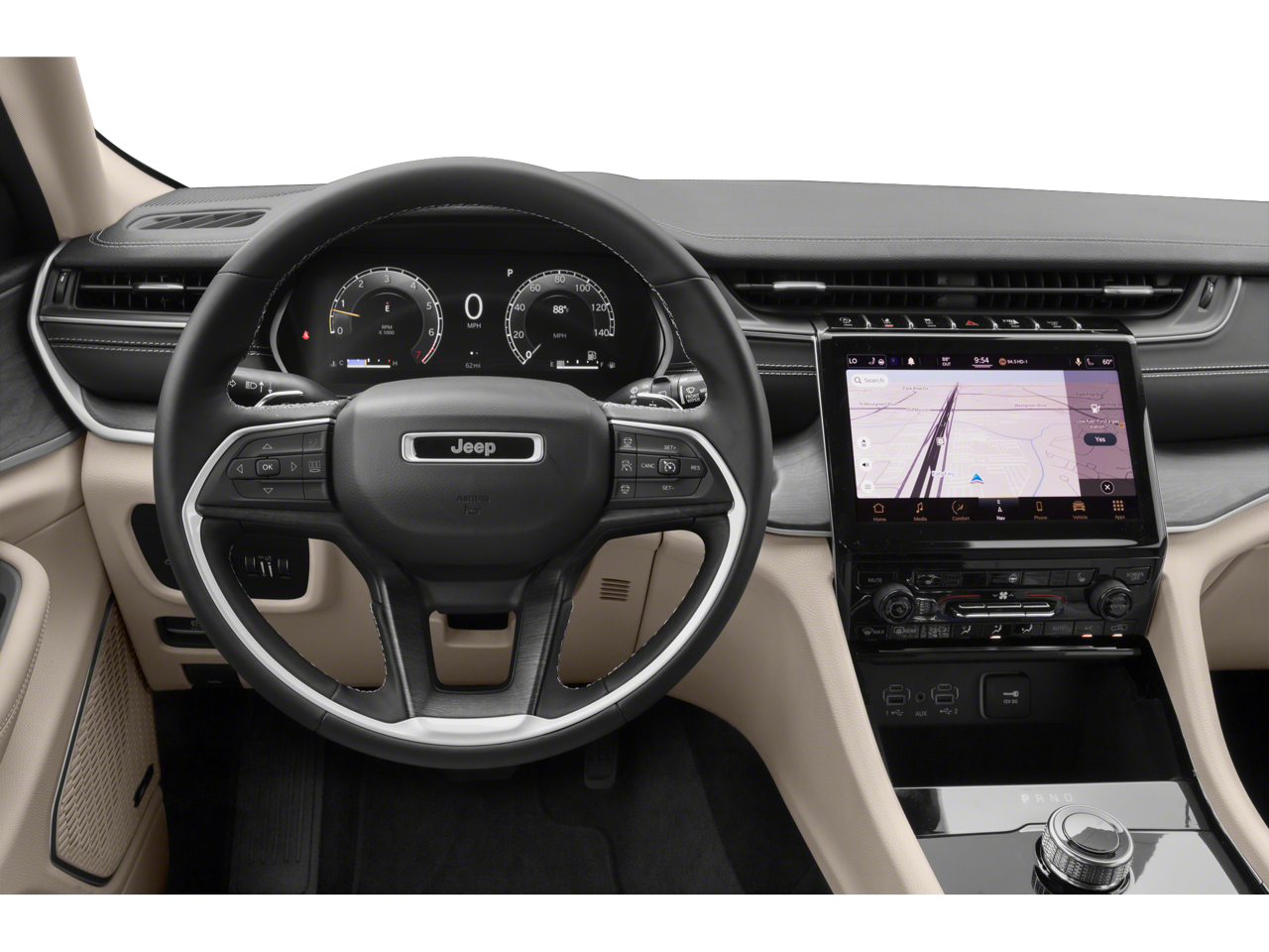 Advanced Tech: Features the Uconnect 5 system with an 8.4-inch display, Wireless Charging Pad, and multiple USB charging ports in all three rows.
