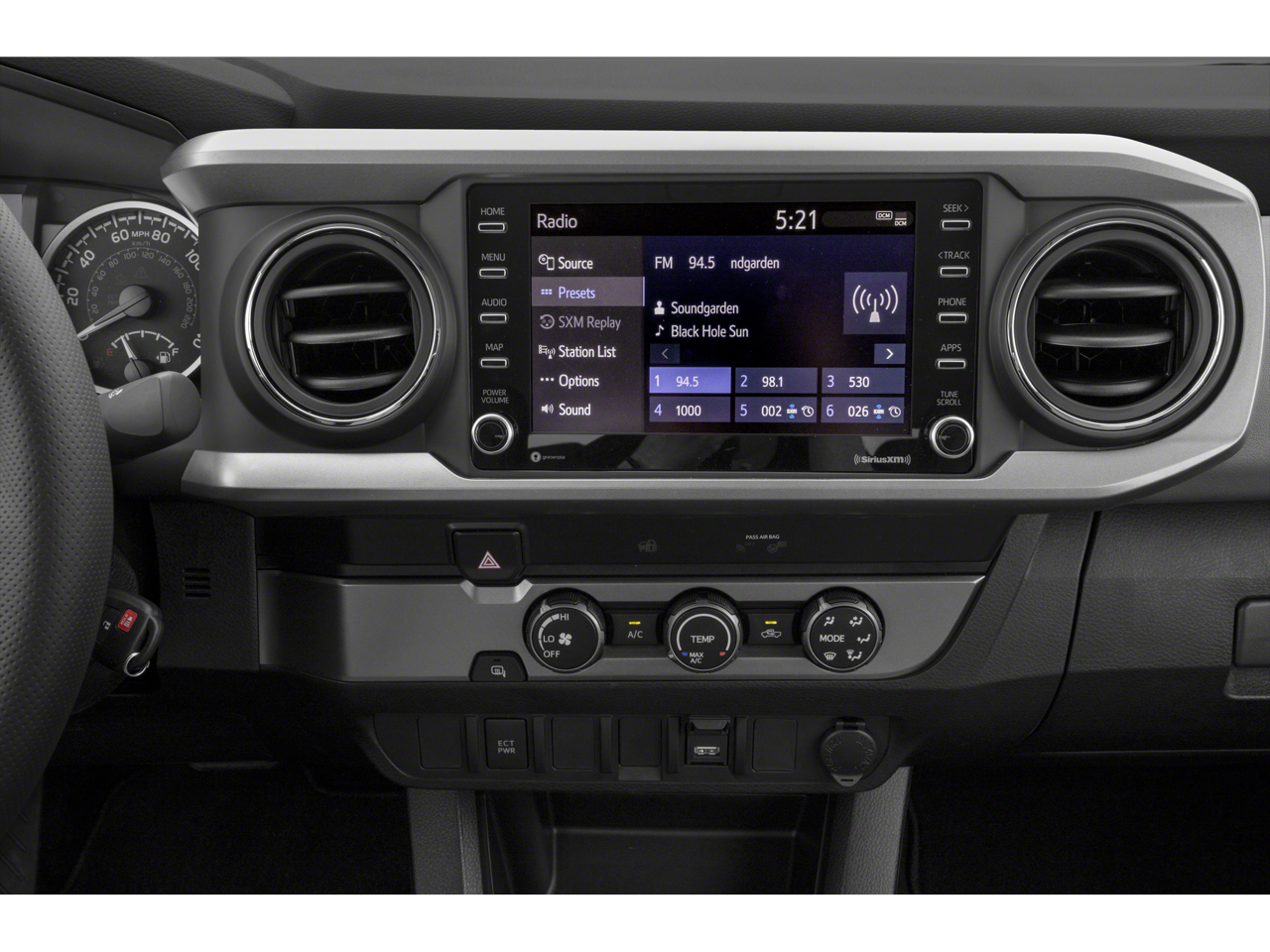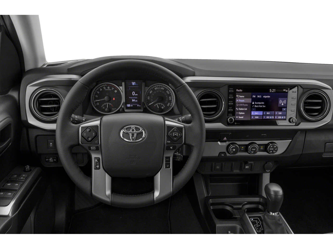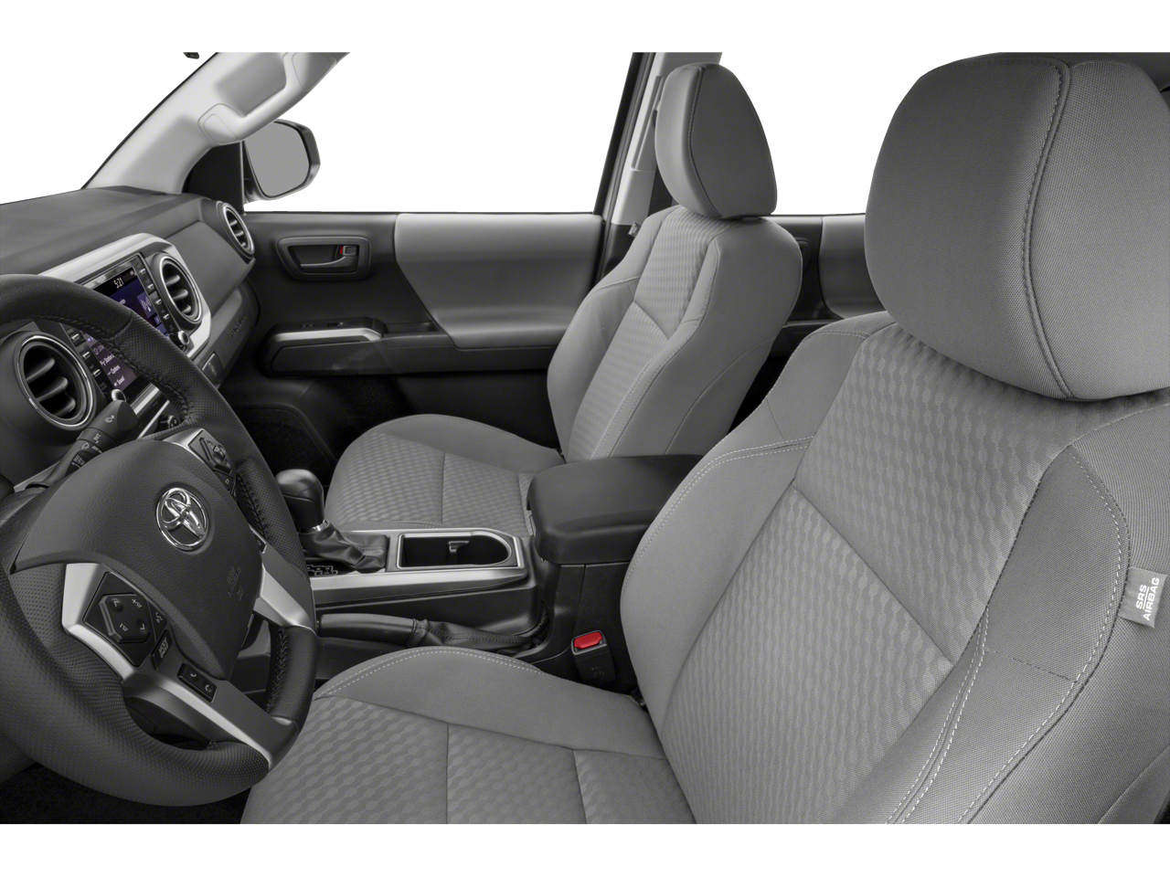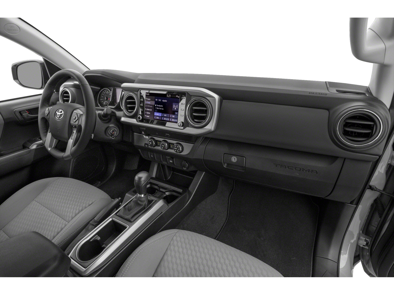 The thoughtfully designed interior of this Tacoma SR5 V6 is both practical and sophisticated. Enjoy the convenience of the SR5 Parking Sonar & Navigation Package, which includes an 8-inch touchscreen, dynamic navigation, and rear parking assist sonar. The SX Package adds a touch of style with black mirror caps, 16-inch black alloy wheels, and a bold gray grille accent.